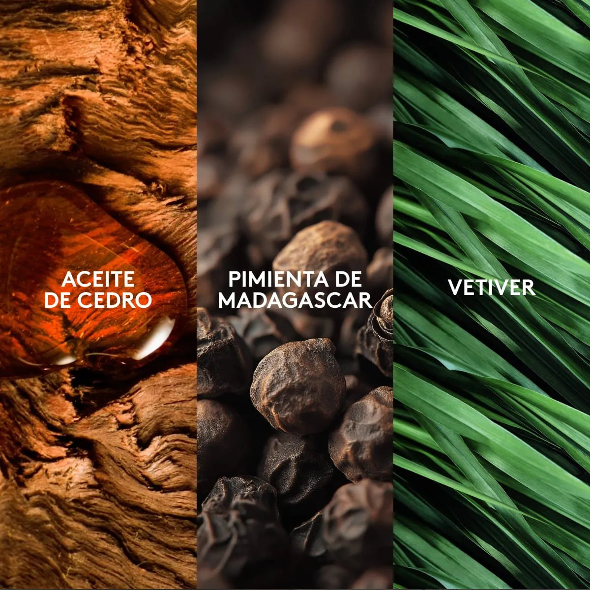 • Notas de corazón: Corazón de Lavandin Frances, Manzana, Aceite de Nuez Moscada de Indonesia, Aceite de Madera de Cedro de Virigina.
