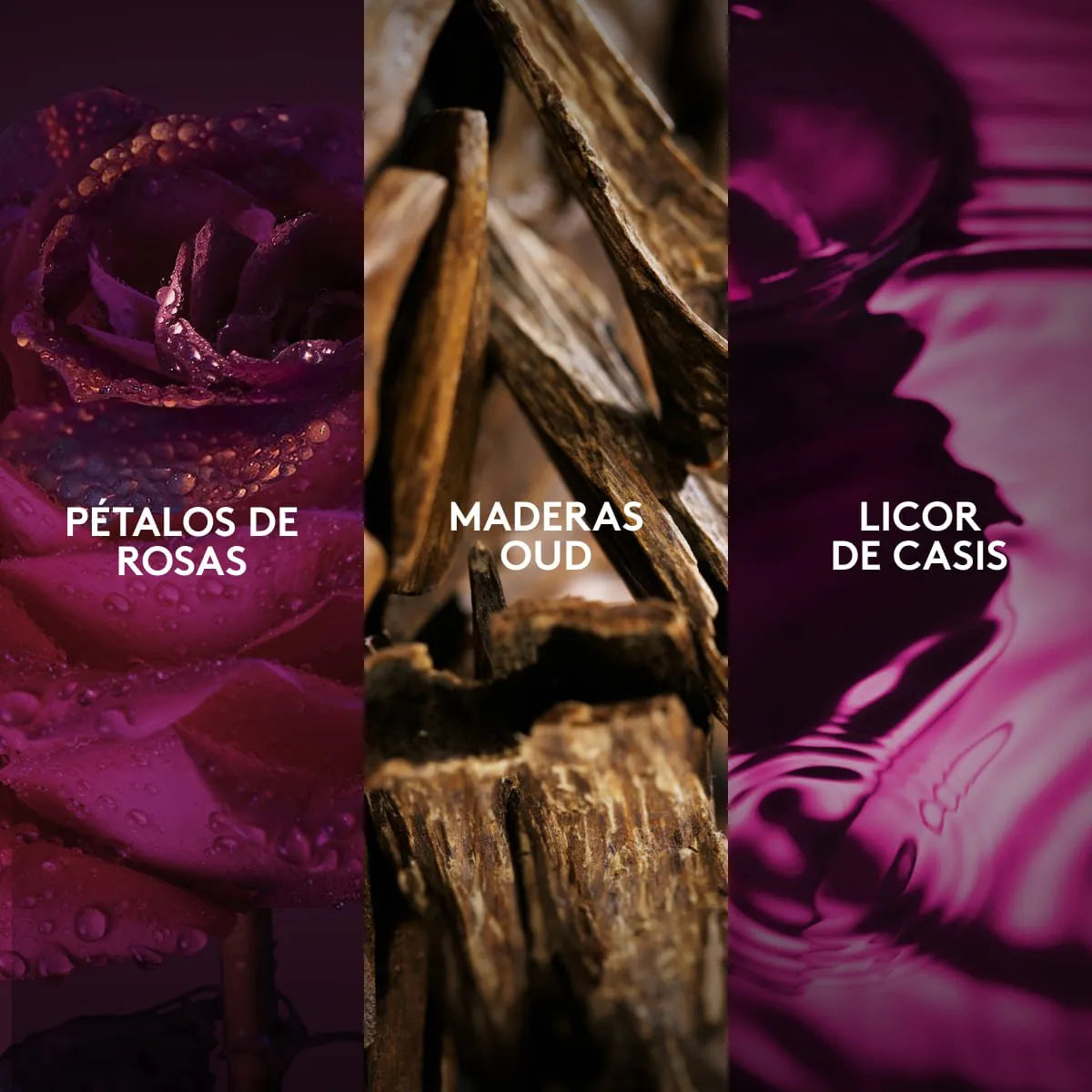 Sus principales notas es el elixir de pétalos de rosa y licor de cassis, que se envuelven en las misteriosas maderas Oud, exclusivo ingrediente de la alta perfumería. Creado con el proceso Essent Tech***.